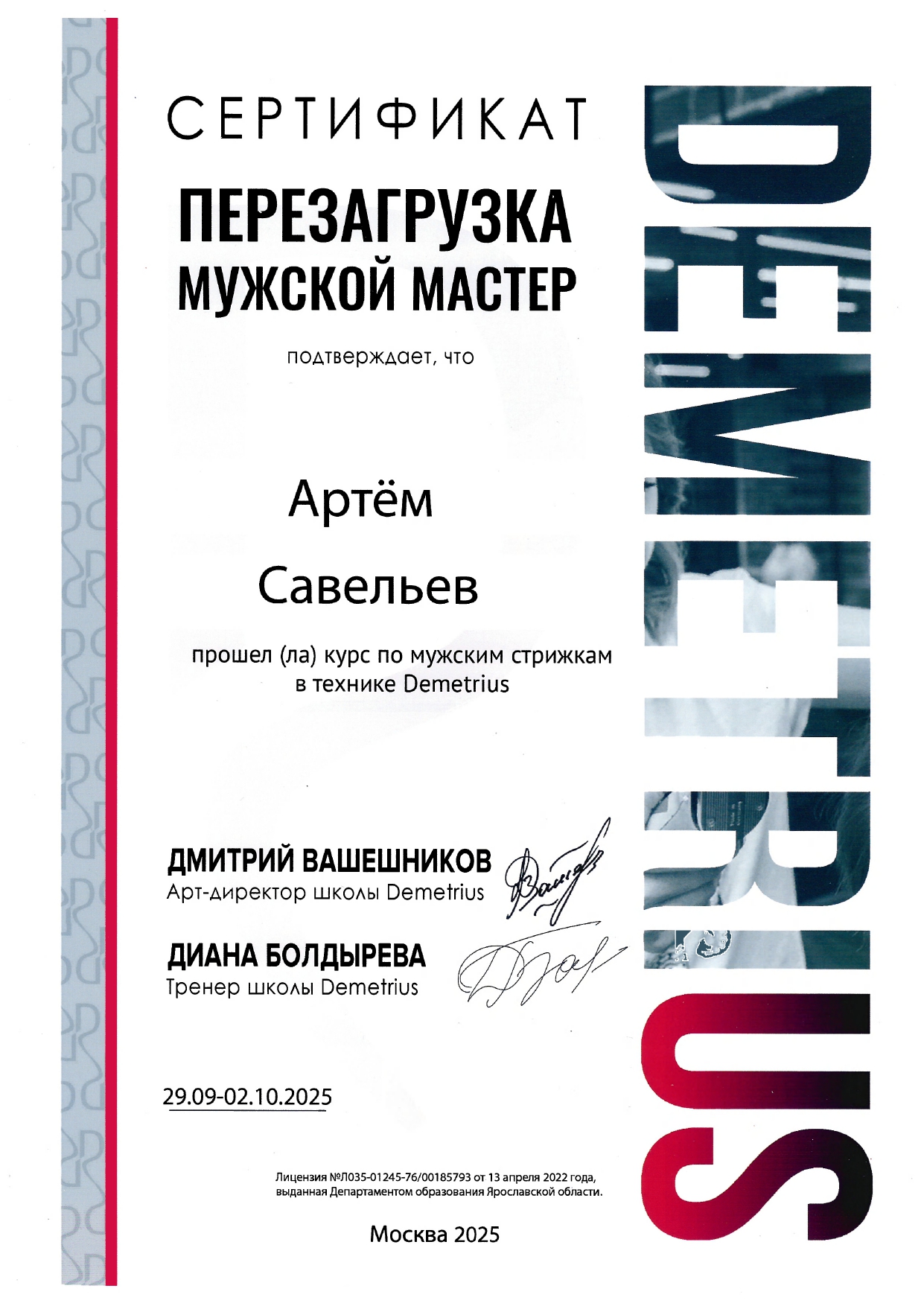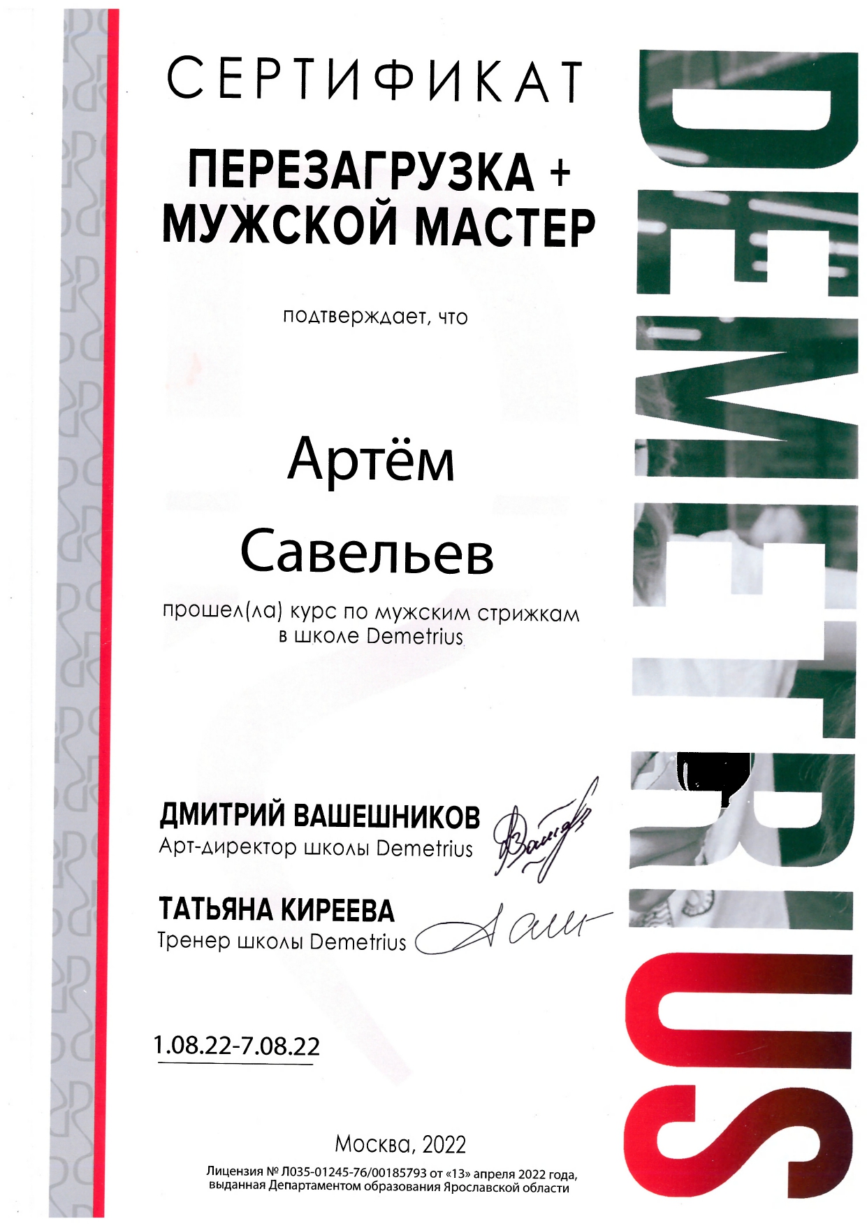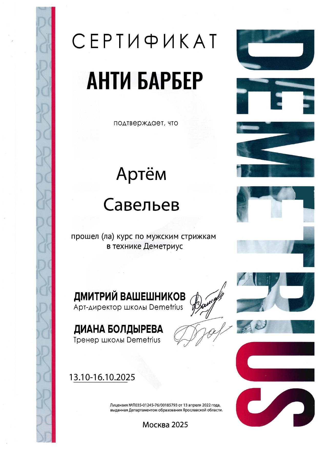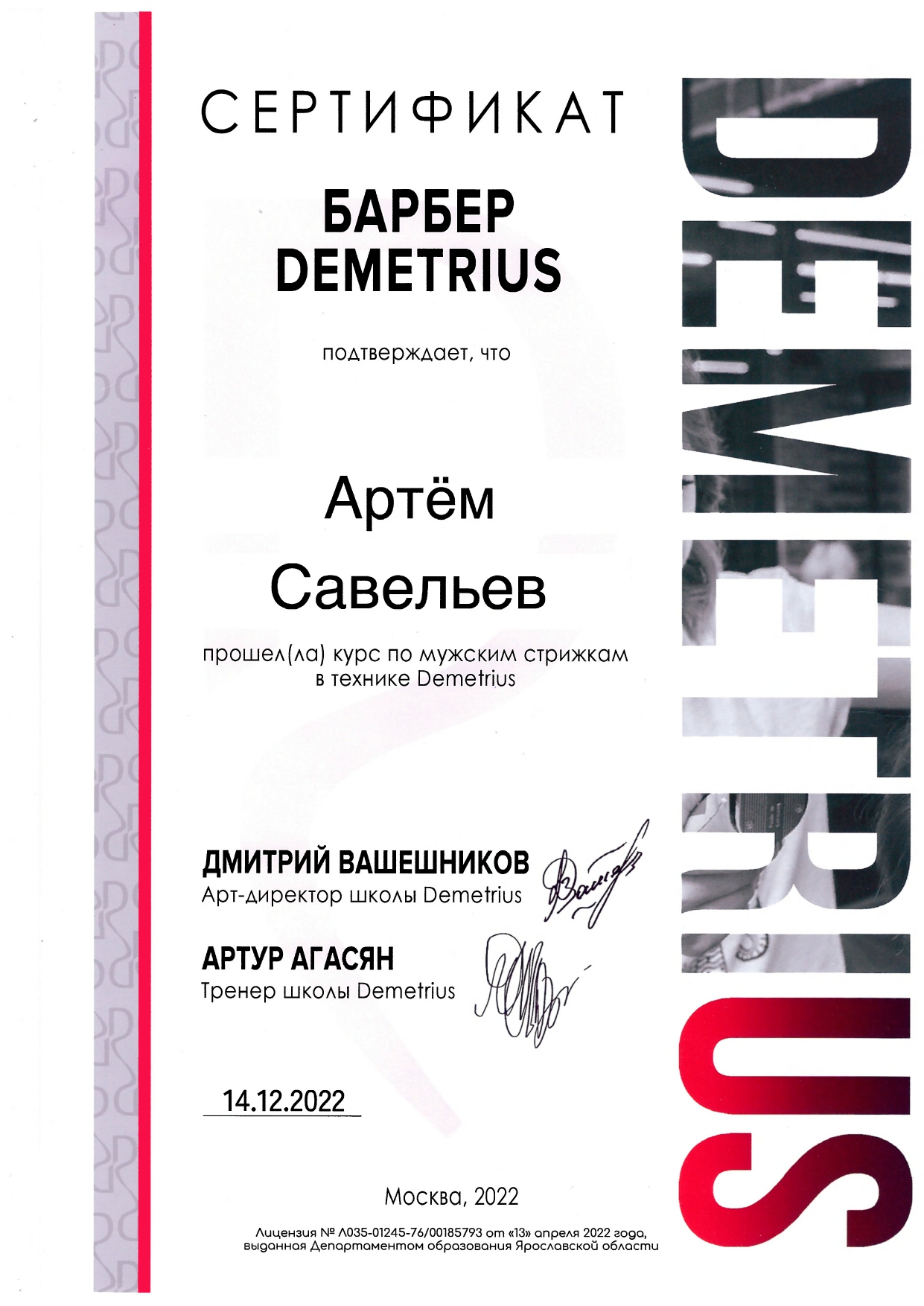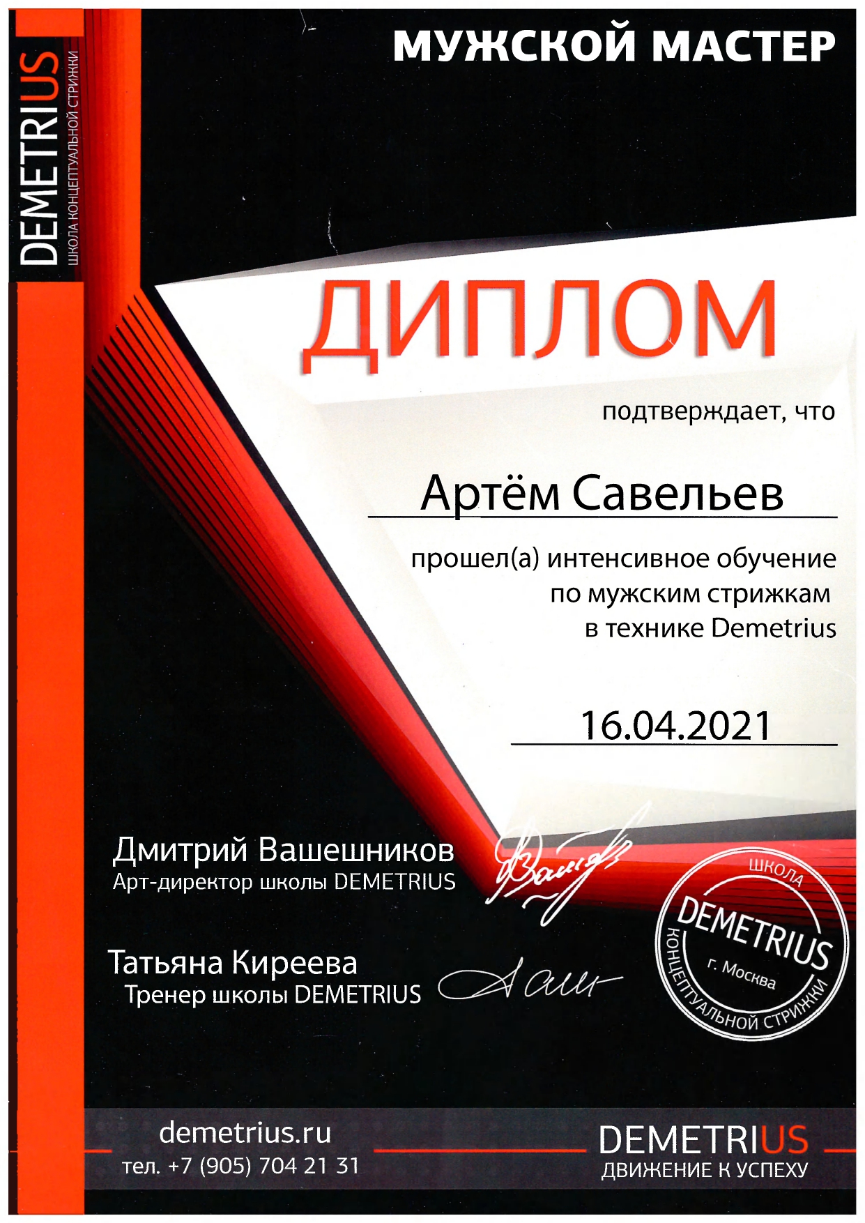 Обучался в Школе концептуальной стрижки «Demetrius» — эталоне парикмахерского искусства в России, и регулярно повышаю квалификацию, посещаю их мастер-классы и изучаю мировые тренды. Владею авторской техникой «Demetrius», благодаря которой стрижка держит форму до 3 месяцев и легко укладывается даже без стайлинга.
