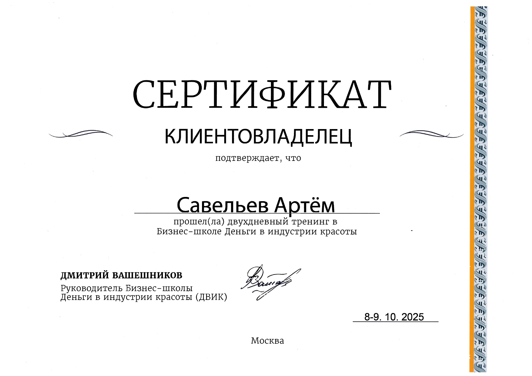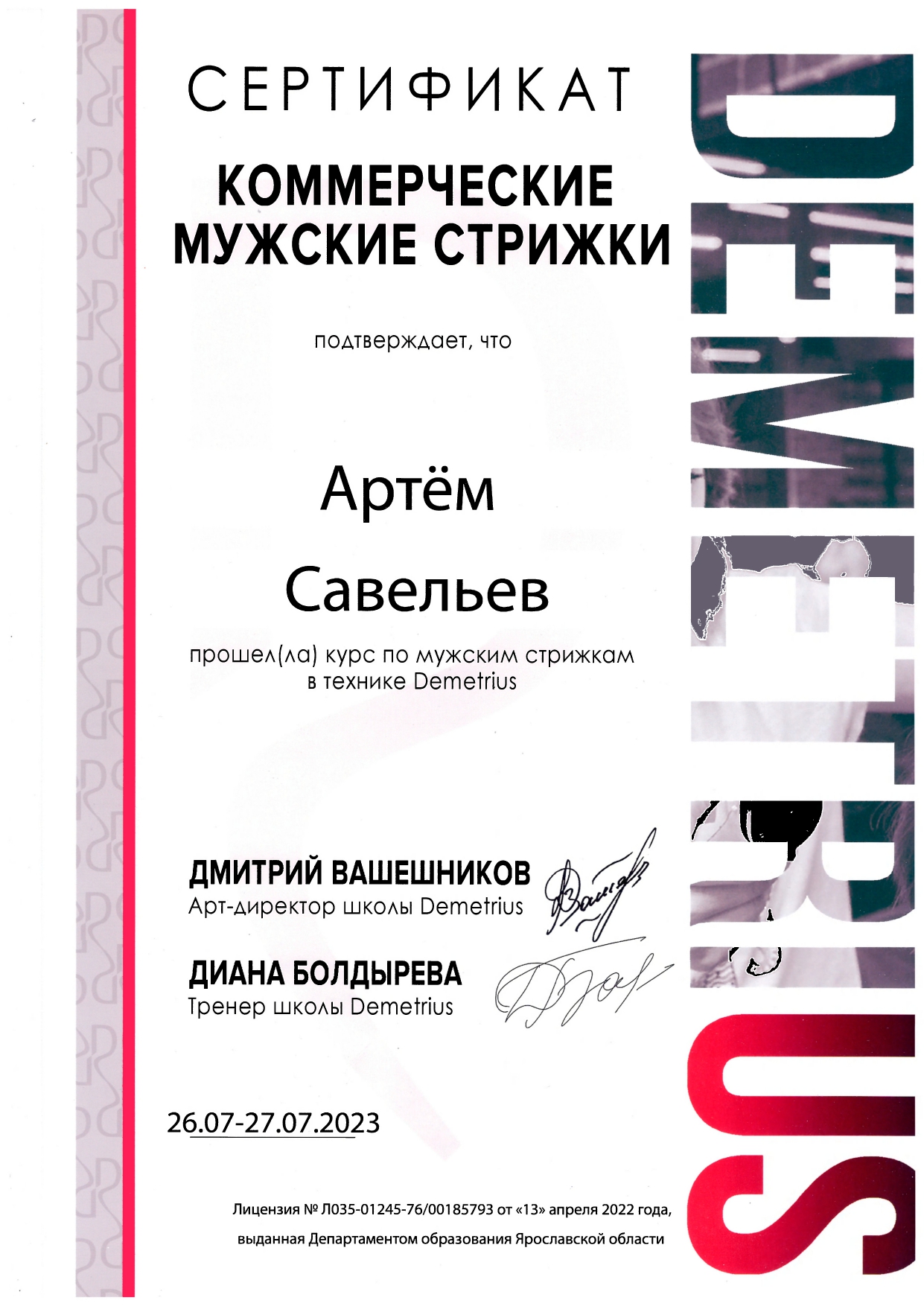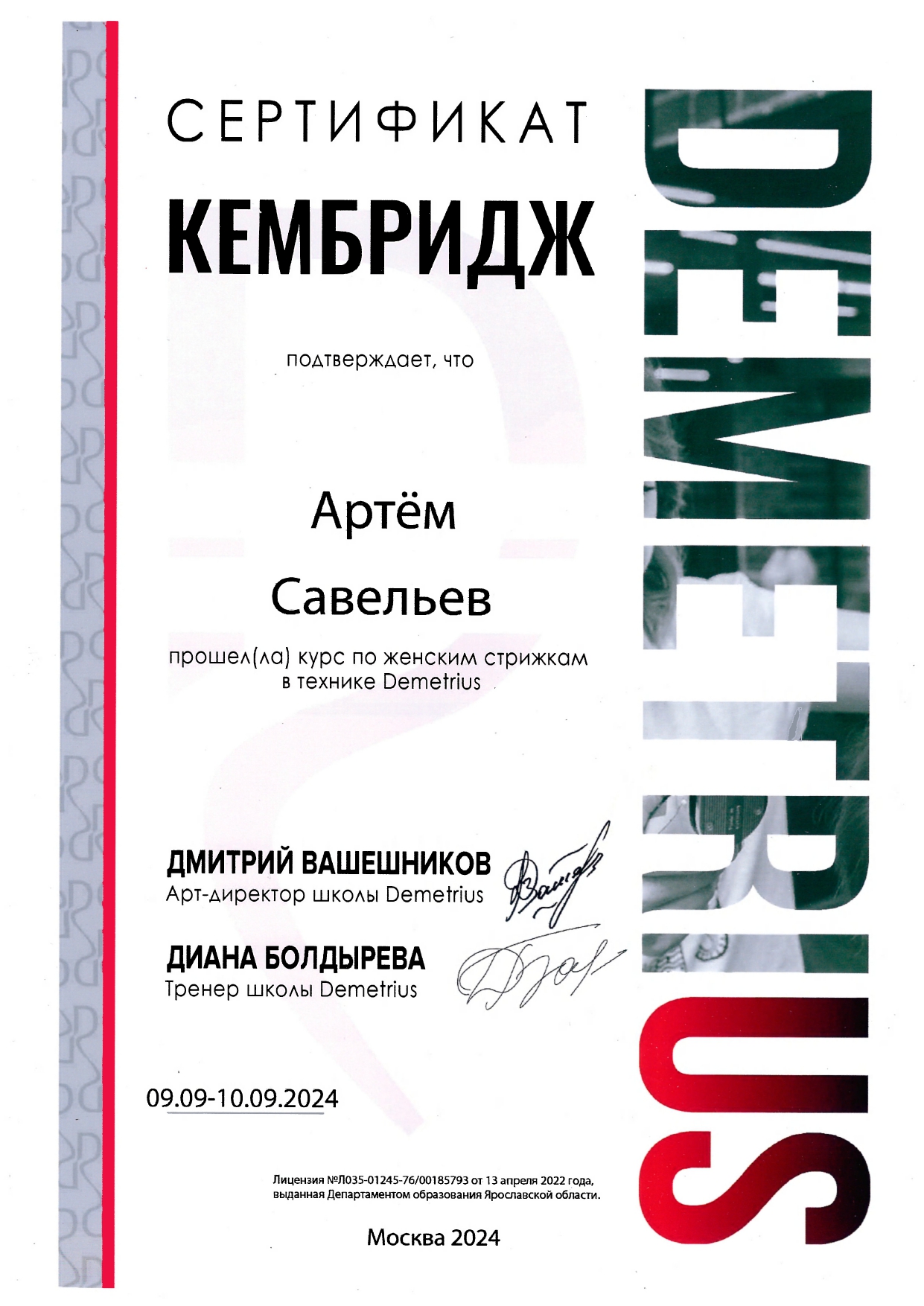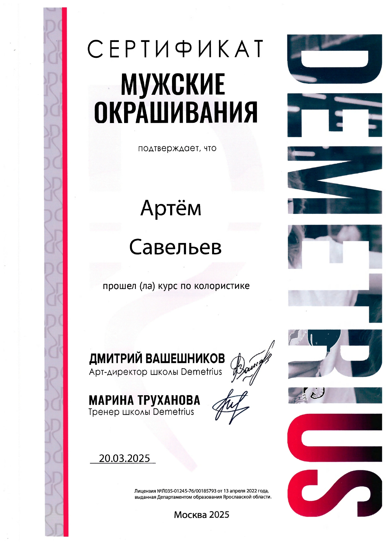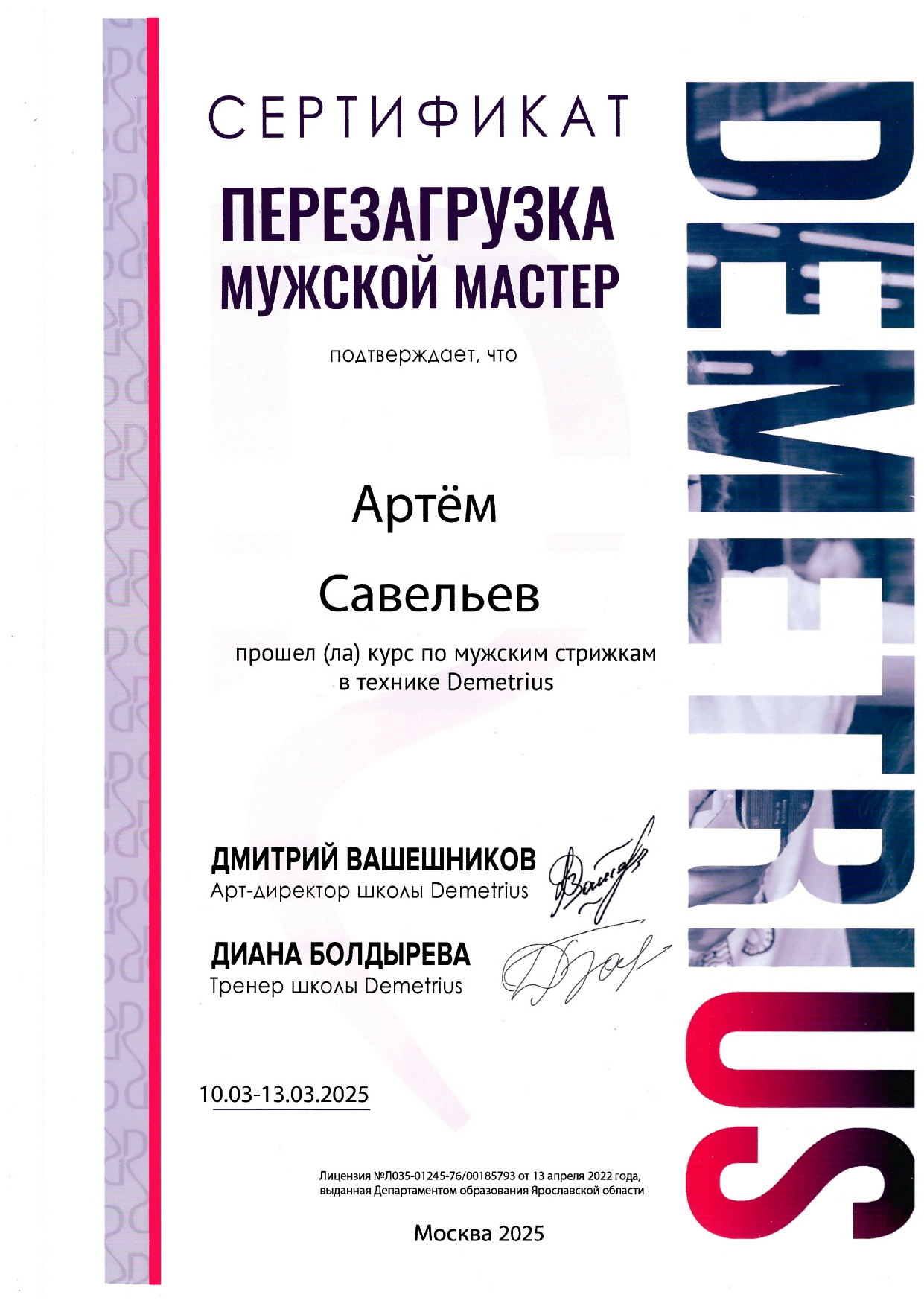 Обучался в Школе концептуальной стрижки «Demetrius» — эталоне парикмахерского искусства в России, и регулярно повышаю квалификацию, посещаю их мастер-классы и изучаю мировые тренды. Владею авторской техникой «Demetrius», благодаря которой стрижка держит форму до 3 месяцев и легко укладывается даже без стайлинга.